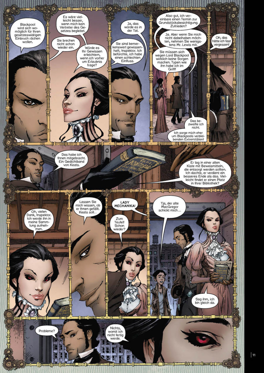 Endlich hat Lady Mechanika eine handfeste Spur, um ihre Vergangenheit aufzuklären! Aber als ihr Freundes Lewis plötzlich beginnt, sich merkwürdig und mitunter gefährlich zu verhalten, rückt ihre Sorge um den Erfinder in den Vordergrund. Lewis hat die Bekanntschaft einer jungen Witwe gemacht, die in gleichem Maße schön wie geheimnisvoll ist...
