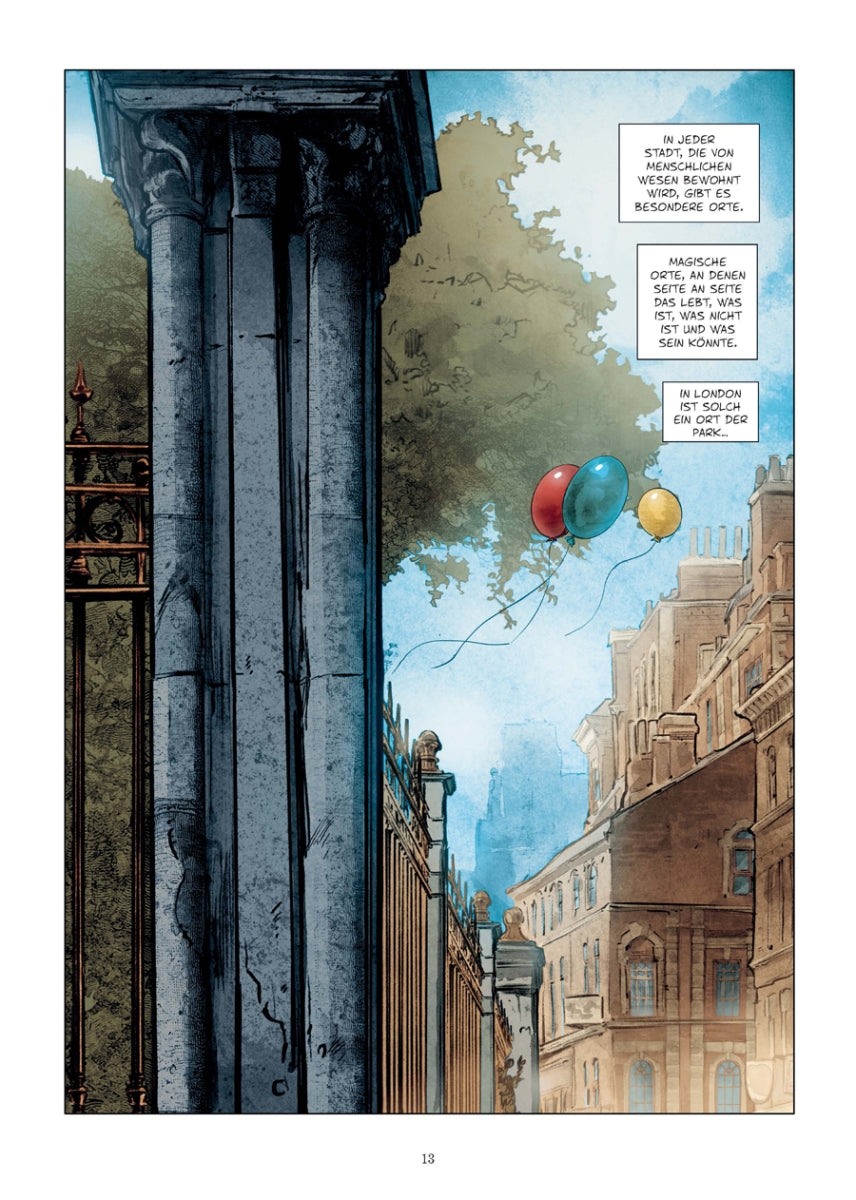 In jeder Stadt gibt es magische Orte, an denen die Mauern zwischen dem, was ist, dem, was nicht ist, und dem, was sein könnte, nur dünn sind. Einer dieser Orte ist Kensington Gardens in London. Bei Tag besuchen ihn Spaziergänger, doch bei Nacht wird er zum Reich der Feen und der Magie – und von Peter Pan, dem Jungen, der nicht erwachsen werden will. In einer solchen Nacht wird die kleine Maimie Mannering im Park eingeschlossen. Nur Peter Pan, der mit den Feen sprechen und im Flug den Park verlassen kann, kann Maimie retten. Doch Peter will seine neue Spielgefährtin eigentlich nicht hergeben…
